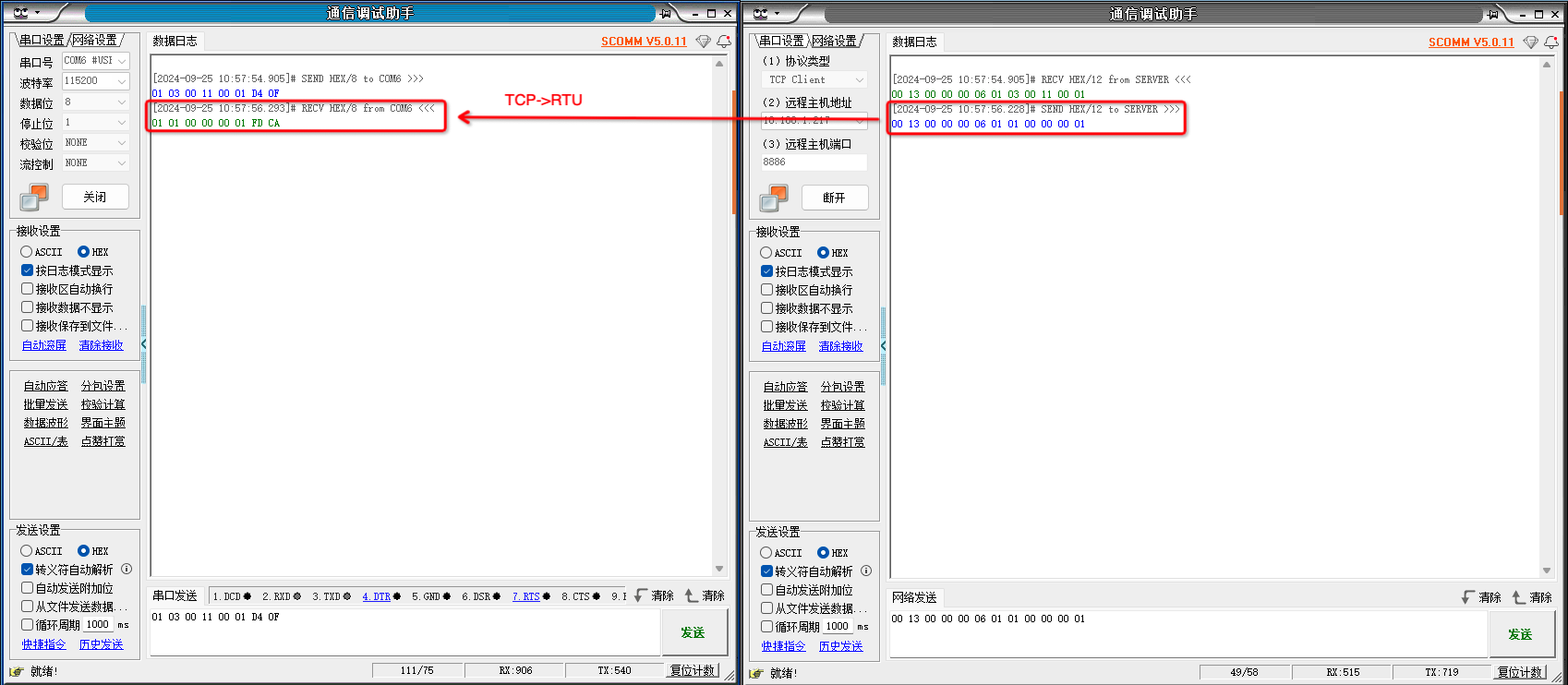 可以看到,简单协议模式下,串口接收的RTU数据转换为TCP协议后,通过网口发送。